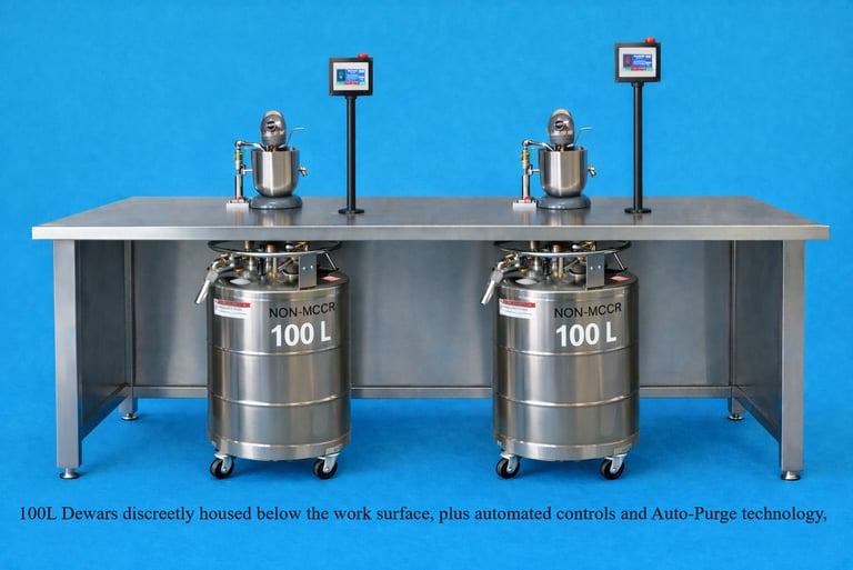 Vacuum-jacketed through-table valve with precision metering cuts LN₂ waste by 30–50%, reducing costs and Dewar changes.